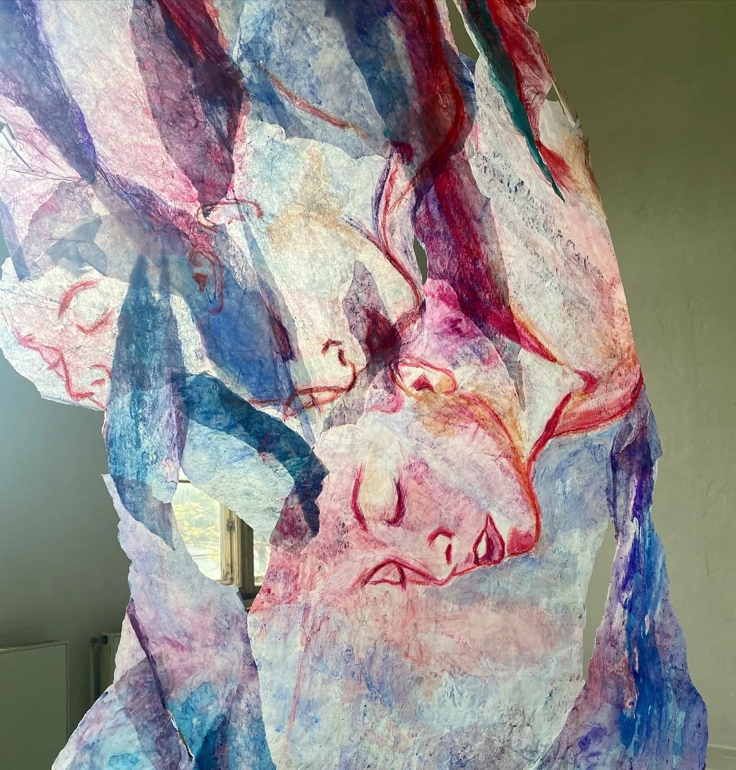 I knew I wanted the work to be larger than life installations that were actually suspended in the air which led to some experimentation of different materials. I landed (no skydiving pun intended) on using layers of trace paper I painted on and collaged together to create installations that were very reactionary to airflow in the room. In this way, the pieces took on a sort of kinetic energy in response to the movement of viewers as they walked about the gallery.
